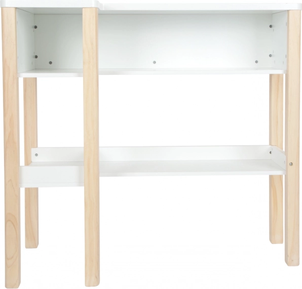 De houten verkoopkraam SMALL FOOT Fresh verandert de kinderkamer in een kleine markt. De minimalistische look in wit en naturel hout past in elk interieur, terwijl de afneembare gestreepte luifel een authentieke winkeluitstraling geeft. Het beschrijfbare bord met plankje nodigt uit tot het maken van opschriften en prijskaartjes.