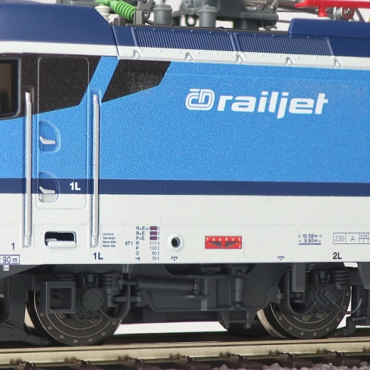 Het model is af fabriek in analoge uitvoering voor DC, voorbereid op digitalisering via de NEM 652-interface. Voor eenvoudig koppelen zijn NEM 362-schachten met kortkoppeling-kinematica aanwezig. De ideale keuze voor realistische inzet van Railjet-treinen op de thuisbaan in schaal H0.
