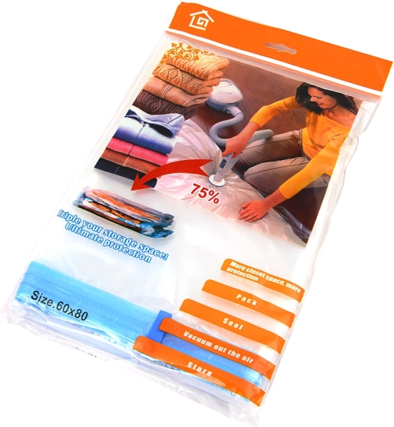 De vacuümzak 60 × 80 cm vermindert direct het volume van opgeborgen spullen en maakt ruimte vrij in kast, koffer of ladekast. De transparante uitvoering maakt oriënteren makkelijk, het duurzame materiaal en het betrouwbare ventiel houden lucht gedurende de hele opslagperiode buiten de zak.