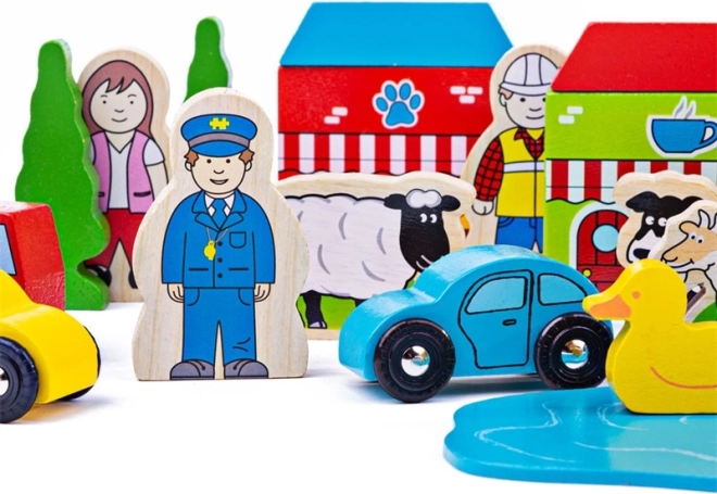Deze uitgebreide set brengt een levendig stadje én het platteland naar elke kinderspoorweg. Je vindt er figurines zoals een politieagent en brandweerman, handige voertuigen waaronder een auto en brandweerwagen, gebouwen, bomen en boerderijdieren – allemaal in duurzaam hout met aangename kleuren. Kinderen kunnen hun eigen verhalen creëren, treinen laten stoppen, het verkeer regelen of voor de boerderij zorgen.