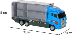 De blauwe vrachtwagen kan niet alleen tot 14 voertuigen vervoeren, maar zijn realistische details maken het een onweerstaanbaar speeltje voor kinderen. Transparante deurtjes en een lanceerder verhogen de spanning.
