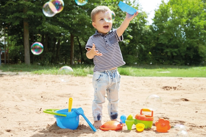 Alles wat kinderen nodig hebben om te bouwen en te vormen: emmer met zeef, gieter, schepjes, hark en vormpjes in vrolijke kleuren.