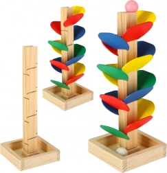 Gekleurde blaadjes en zachte geluiden bij de landing van de knikkers houden de aandacht van kinderen vast, ondersteunen concentratie en kleurwaarneming.