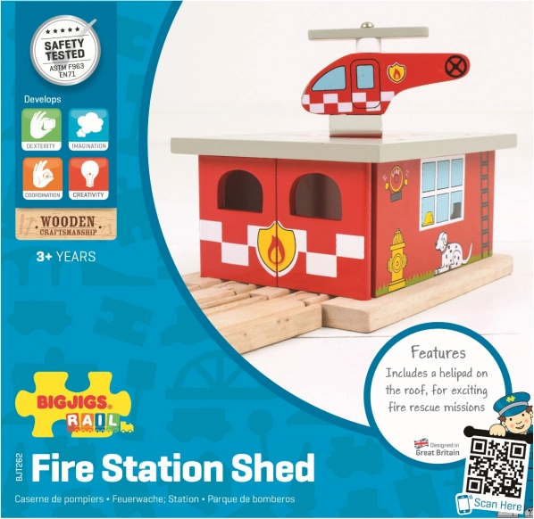 Breid de kinderwereld van treinen uit met een actievolle brandweerkazerne met heliport. Gedetailleerde prints, een doorrijdconstructie en de meegeleverde helikopter nodigen uit tot spannende verhalen en reddingsmissies. Het station is zorgvuldig vervaardigd van hoogwaardig hout en voldoet aan de Europese veiligheidsnormen.