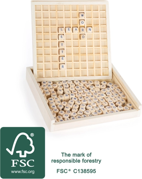 Het spel bevat 145 letterstukken, die na het spelen handig kunnen worden opgeborgen in de praktische houten doos die ook geschikt is voor reizen. Het spel helpt kinderen niet alleen hun woordenschat te vergroten, maar ook om spelling te leren.
