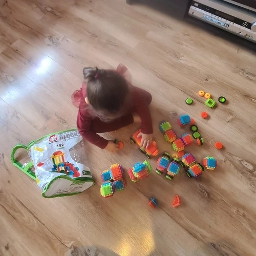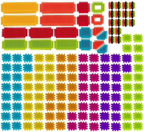 Deze kleurrijke bouwset met egelstructuur laat kinderen oneindig veel creaties maken – van huisjes en voertuigen tot fantasiekastelen. De onderdelen hebben afgeronde uiteinden voor veilig spelen vanaf 3 jaar en zijn makkelijk te koppelen en los te maken.