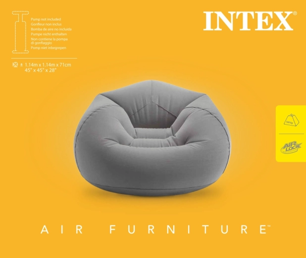 Dankzij de opblaasbare constructie is de fauteuil ideaal voor de woonkamer, studentenkamer, het vakantiehuis of een kantoor in de relaxzone. Eenvoudig op te blazen en leeg te laten lopen, zodat je hem moeiteloos kunt verplaatsen en opbergen. De grijze uitvoering past bij de meeste decors en benadrukt de strakke lijnen van modern wonen.