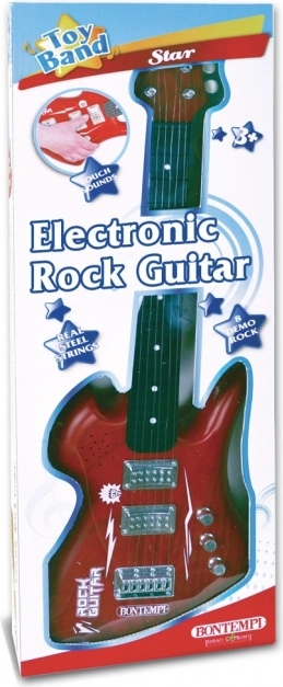 De rode Bontempi rockgitaar met een hoogte van 62 cm zal kleine muzikanten blij maken. Hij heeft 6 metalen snaren met geluid bij indrukken, 8 voorgeprogrammeerde melodieën en werkt op 2× AA-batterijen (niet inbegrepen).