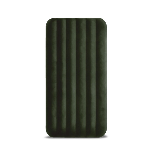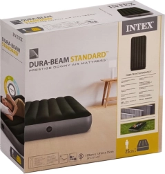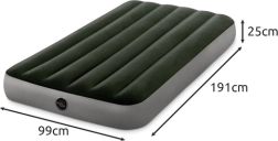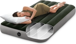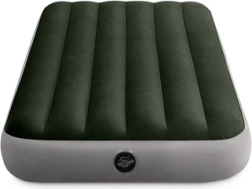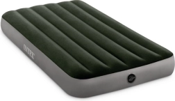Het eenpersoons opblaasbare luchtbed van INTEX met Dura-Beam™ en Fiber-Tech™ biedt een stabiele ondersteuning, een comfortabel velours oppervlak en snel opblazen en leeglaten dankzij de 2-in-1 ventiel. Draagvermogen 136 kg, ideaal voor thuis, tent en kamperen.
