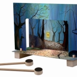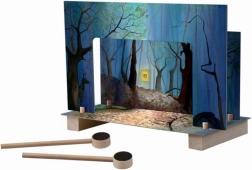 De figuurtjes bewegen 'vanzelf' over het toneel met behulp van magnetische stokjes onder het decor – leuk, eenvoudig en zonder touwtjes.