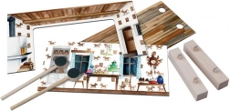 Hout (onderdelen en stokjes), karton/papier (decors)