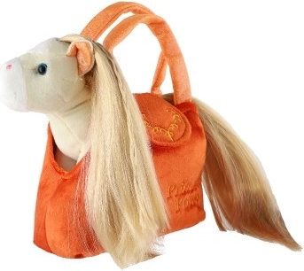 Deze oranje pluche handtas verbergt een schattig paardje binnenin, dat je op elk moment eruit kunt halen en weer terug kunt stoppen. De lange, zachte manen nodigen uit om te kammen en vlechtjes te maken, wat de fijne motoriek en creativiteit stimuleert.