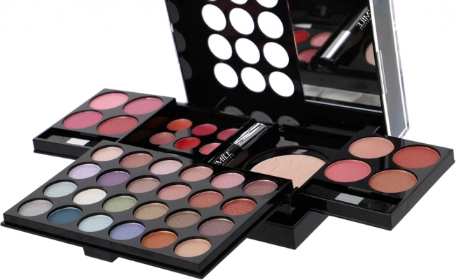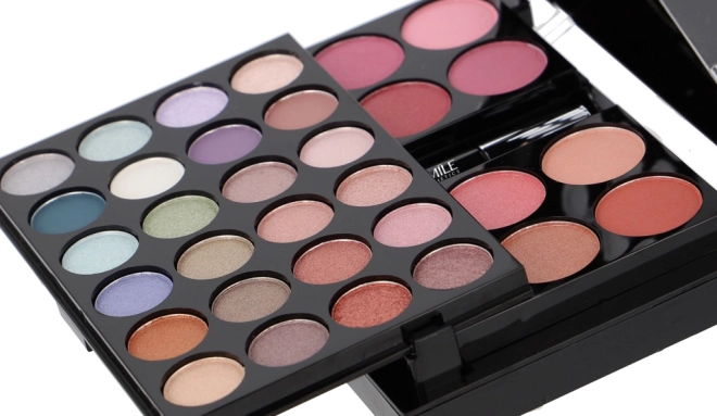 24× oogschaduw, 8× blush, 6× romige lipgloss, 1× poeder, 1× mascara, 1× set van 4 applicators/penselen, geïntegreerde spiegel