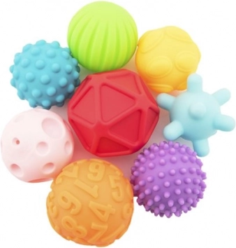Ontdek de set van acht getextureerde ballen die is ontworpen om de zintuiglijke waarneming en coördinatie van je kind te ontwikkelen. De verschillende kleuren en texturen zorgen voor interactief en leuk spel.