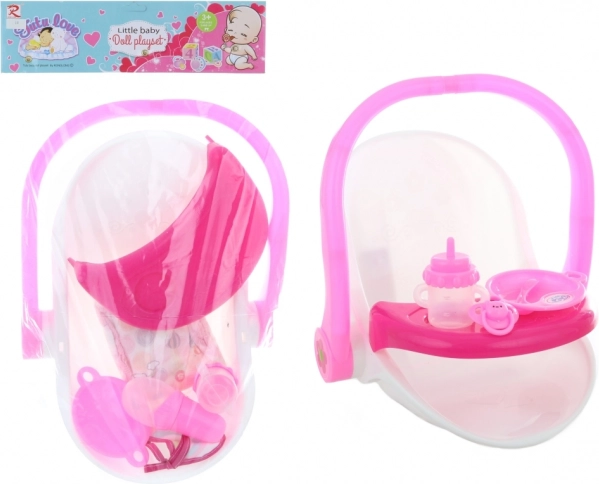 Praktische plastic draagmand voor een pop met een uitgebreide set accessoires om te spelen voor kleine verzorgers. In de verpakking zitten een bordje, bestek, luier, flesjes en andere accessoires. Dankzij de compacte afmetingen is de draagmand makkelijk mee te nemen en geweldig voor kinderlijke verbeelding en rollenspel. Geschikt voor kinderen vanaf 3 jaar.