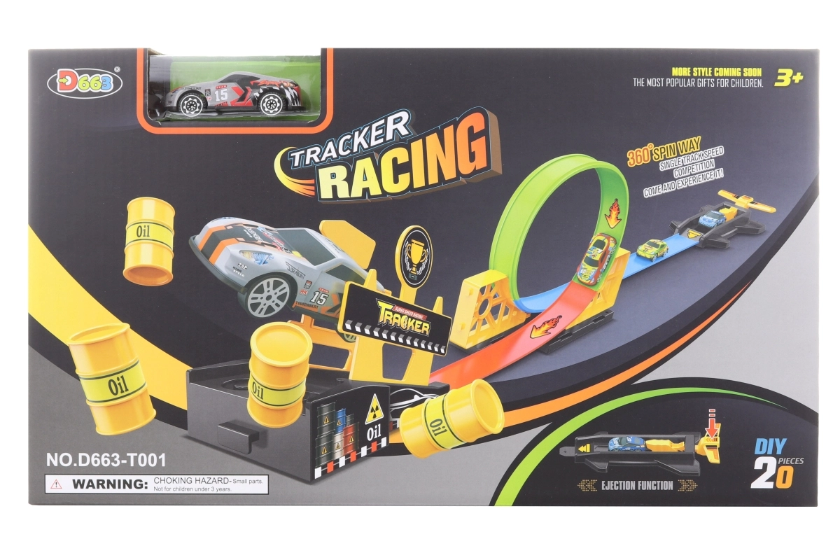 Lanceerbaan met metalen autootje. Lengte van de baan ca. 125 cm. Afmetingen van de verpakking ca. 38 x 22 x 6 cm. Leeftijd 3+