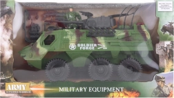 Dit militaire gepantserde voertuig is perfect voor alle kleine liefhebbers van militaire techniek. Het voertuig heeft een afmeting van 30 x 15,5 cm en bevat realistische details, waaronder een machinegeweer. De verpakking bevat ook een soldatenfiguur die bijdraagt aan de authenticiteit.