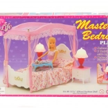 Verwen poppen met een luxe nachtrust met het elegante GLORIE hemelbed. De set bevat een bed met sprei en kussentje, twee nachtkastjes en twee lampjes die gaan branden wanneer je de cilinder draait. Ideaal voor creatief spel en stijlvolle poppenhuizen.