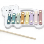 De houten xylofoon in de vorm van een ijsbeer combineert een speelse uitstraling met een functioneel muziekinstrument. Pastelkleurige metalen lamellen produceren een aangename klank bij aanslag met de houten slagstok, waardoor kinderen van nature worden gemotiveerd om te experimenteren met geluiden en ritme.