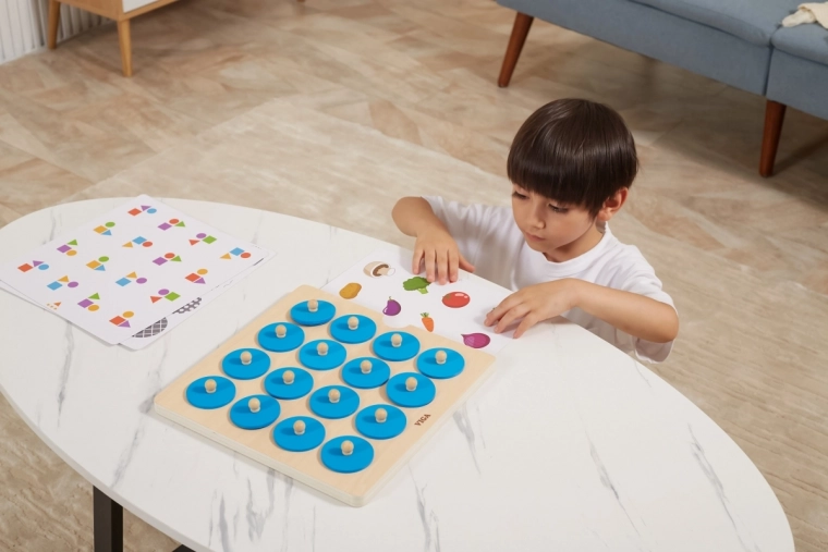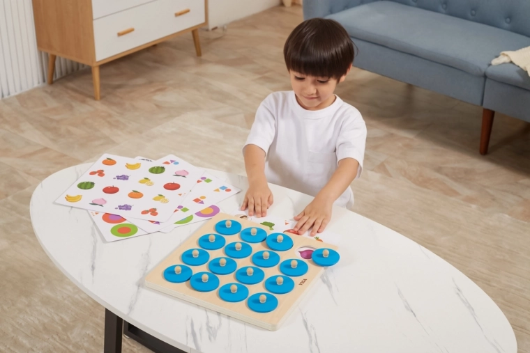Dankzij de 10 verwisselbare kaarten met kleurrijke motieven (dieren, fruit, groenten, vormen enz.) pas je de moeilijkheidsgraad gemakkelijk aan de leeftijd en vaardigheden van het kind aan. Het spel is gemaakt van duurzaam hout en afgewerkt met veilige, niet-giftige verven, ideaal voor dagelijks gebruik thuis en in kleuterscholen.