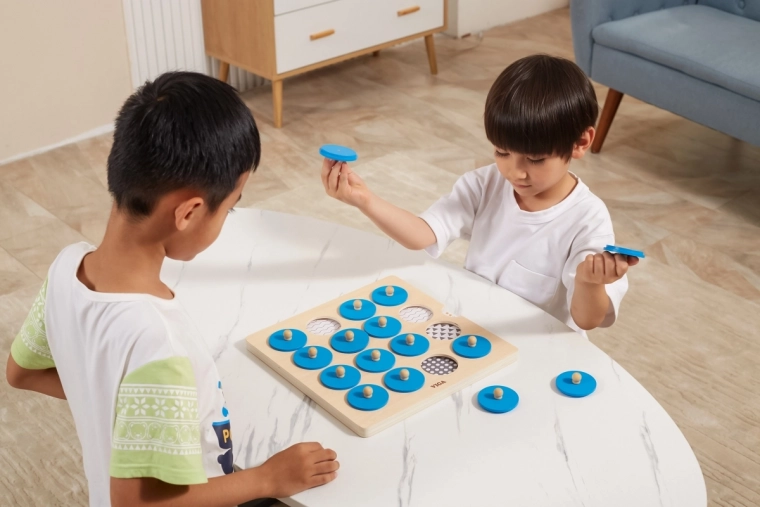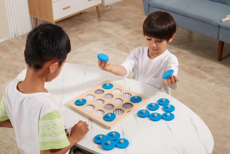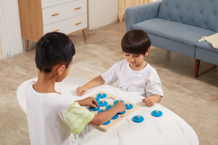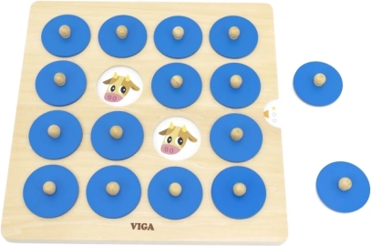 Dit kwalitatieve houten geheugenspel van VIGA is een geweldige manier om bij kinderen de cognitieve ontwikkeling en het visuele waarnemingsvermogen te stimuleren. Het kind tilt een blauw schijfje op aan het houten knopje, onthoudt de afbeelding en zoekt de tweede identieke – een eenvoudige mechaniek die zowel vermaakt als leert.