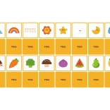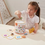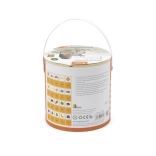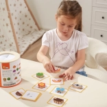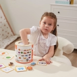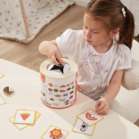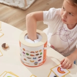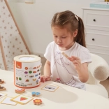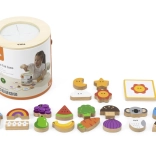 Spel Vang en vind. De set bevat 20 blokken, een papieren emmer, 20 speelkaarten en een deksel. Afmetingen van de verpakking ca. 16 x 15,5 cm. Leeftijd 3+