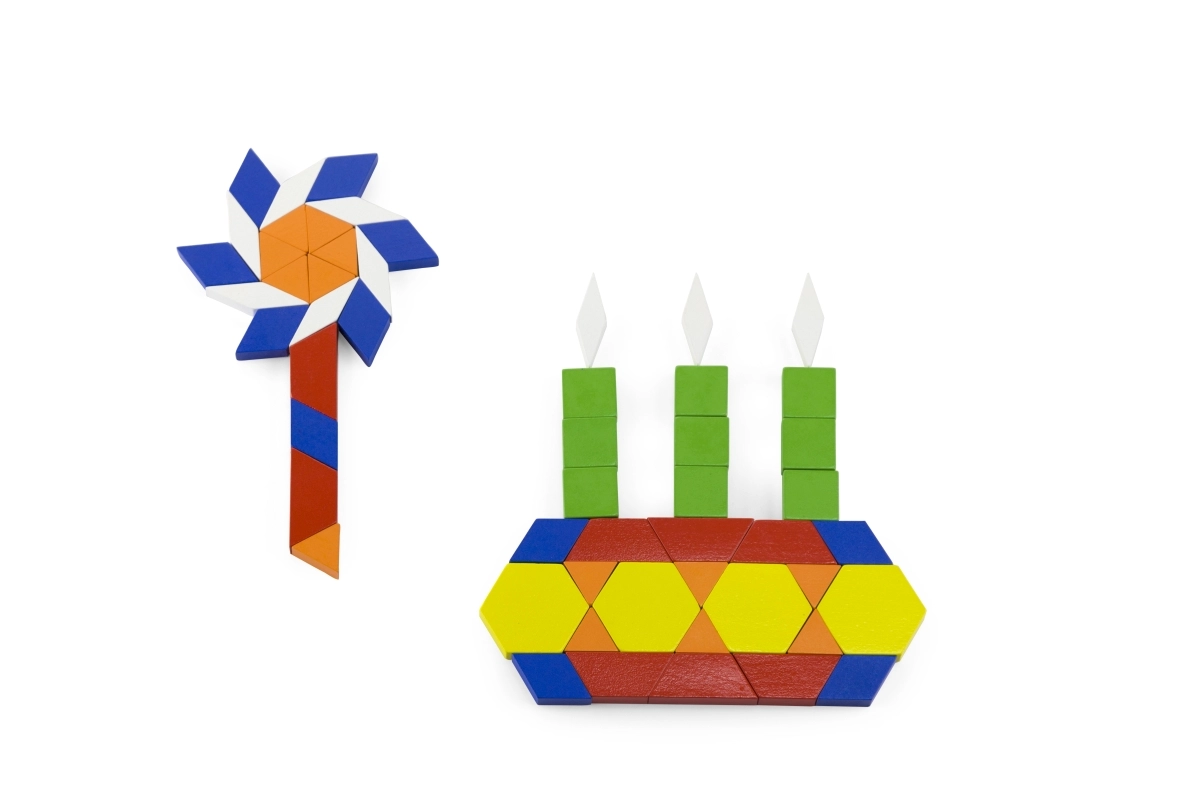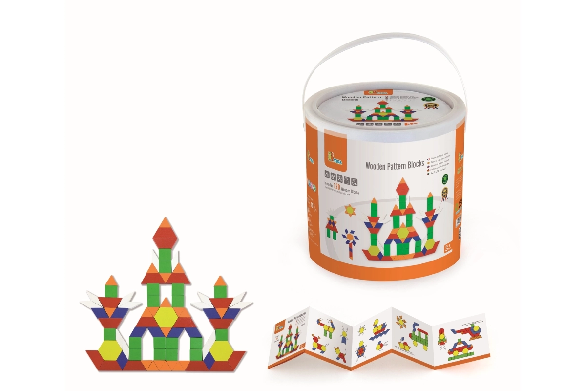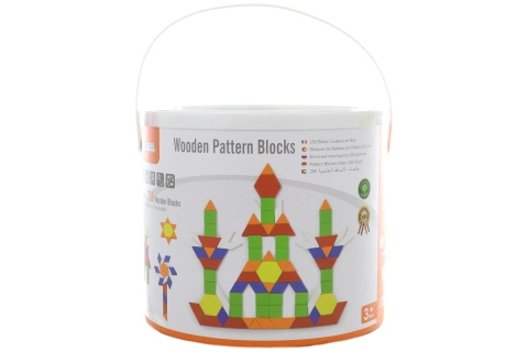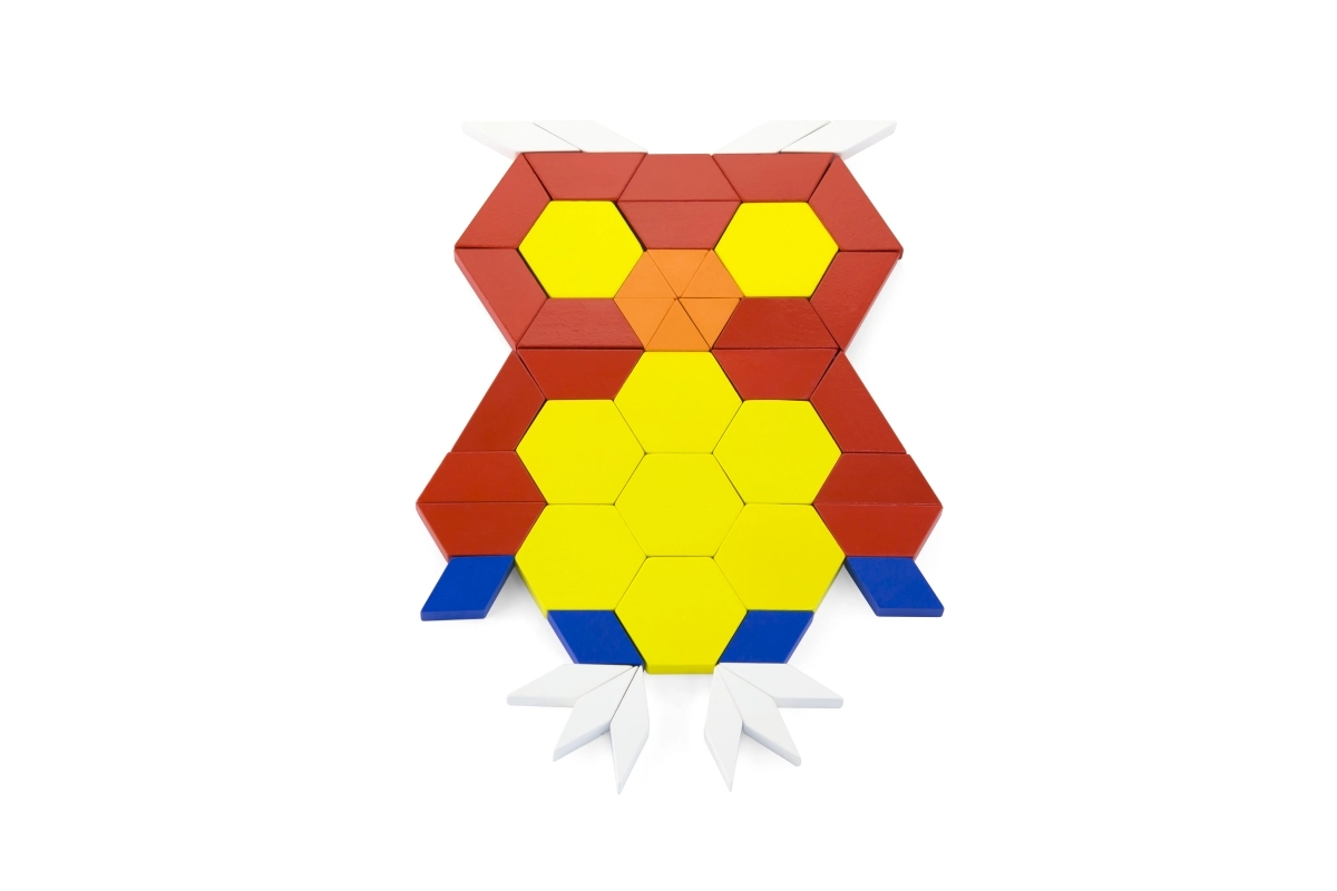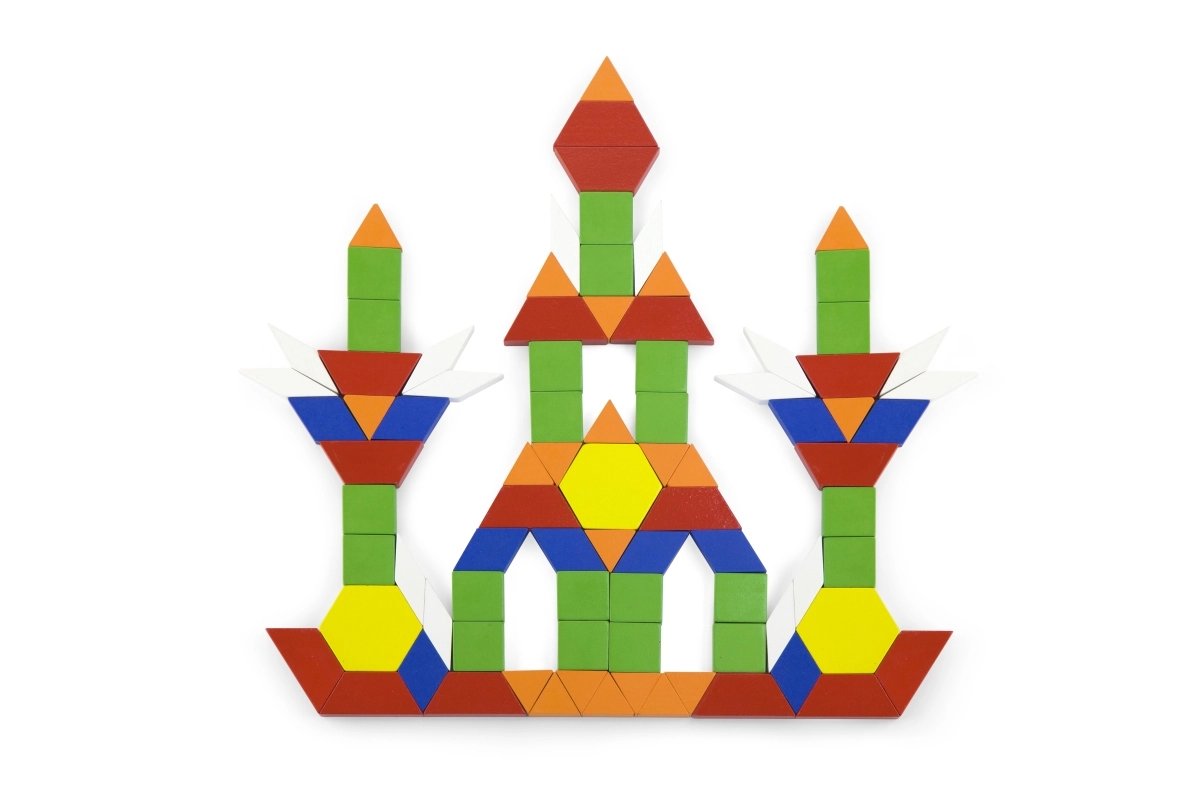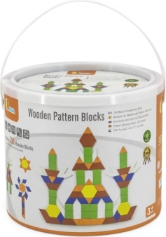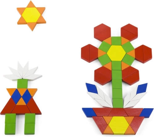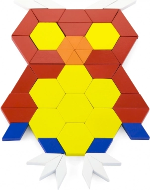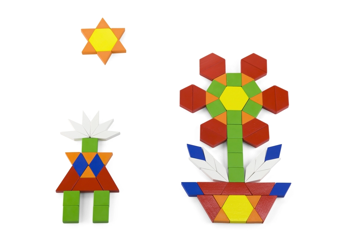 Het grote aantal platte houten blokken in diverse vormen en kleuren stimuleert de fantasie en de ontwikkeling van ruimtelijk inzicht. Kinderen kunnen patronen, dieren en complete afbeeldingen leggen.