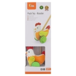 Deze duwer met kip ondersteunt kinderen bij de ontwikkeling van hun loopbeweging en coördinatie.