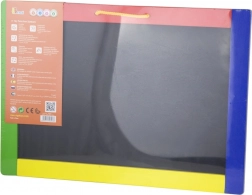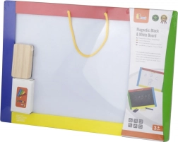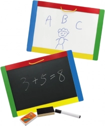 Dit veelzijdige bord combineert twee creatieve oppervlakken in één – een zwarte magnetische zijde voor krijt en een witte uitwisbare zijde voor de stift. Kinderen kunnen schrijven, tekenen en letters en cijfers oefenen; op de zwarte zijde bevestigen ze bovendien eenvoudig magneetjes. In de verpakking vind je alles voor direct gebruik: 4 krijtjes, een uitwisbare stift en een sponsje.