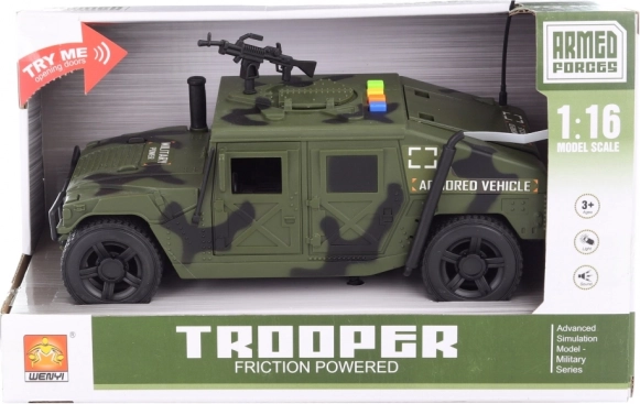 Een realistische militair auto op batterijen zal elke kleine bestuurder blij maken. Bij het indrukken van de knoppen geeft hij geluiden en licht, heeft openende deuren en compacte afmetingen, ideaal voor spelen binnen en buiten. De voeding wordt geleverd door de meegeleverde AG13-batterijen. Geschikt voor kinderen vanaf 3 jaar.
