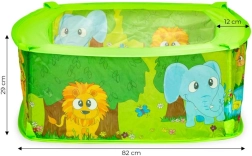 Speelhek met bodem en 50 balletjes – niet voor water. Afmetingen ca. 75 cm x 75 cm x 30 cm. Inbegrepen in de verpakking: 50 balletjes. Het ballenbad kan thuis in de kinderkamer worden gebruikt, maar ook ’s zomers buiten in de tuin. Kinderen beleven veel plezier tijdens het spelen. Leeftijd 6 mnd+
