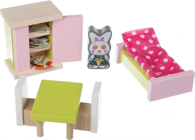 Houten meubelset voor poppen van het merk CUBIKA zal uw kinderen verheugen met zijn kwaliteit en design. Bevat 16 nauwkeurig vervaardigde onderdelen, waaronder een bed, een kledingkast en een tafel met twee stoelen.