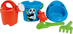 Schattige 6-delige zandset van ANDRONI met pandamotief maakt kleine bouwers blij op het strand en in de zandbak. Gemaakt in Italië van hoogwaardig kunststof, veilig vanaf 12 maanden en compleet uitgerust: emmer (Ø 13 cm, hoogte 11 cm), gieter 0,5 l, zeef, schepje, harkje en een vormpje in de vorm van een schildpadje.