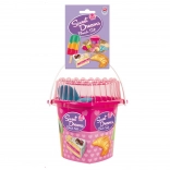 - Hartvormige emmer met deksel, schep, harkje, 4 vormpjes (softijs, ijsje op stok, ruitentaart, croissant)