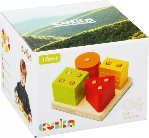 De didactische speelset CUBIKA We sorteren vormen bevat 16 kleurrijke geperforeerde geometrische stukjes en een stevige vierkante basis met pinnetjes. Kinderen ontdekken spelenderwijs verschillen tussen vormen en kleuren, oefenen hun greep en oog-handcoördinatie en ontwikkelen fantasie en geduld. Zorgvuldige afwerking van esdoorn- en beukenhout en duurzame, niet-schadelijke verf op waterbasis garanderen een lange levensduur en veilig spelen.