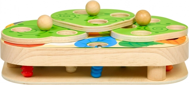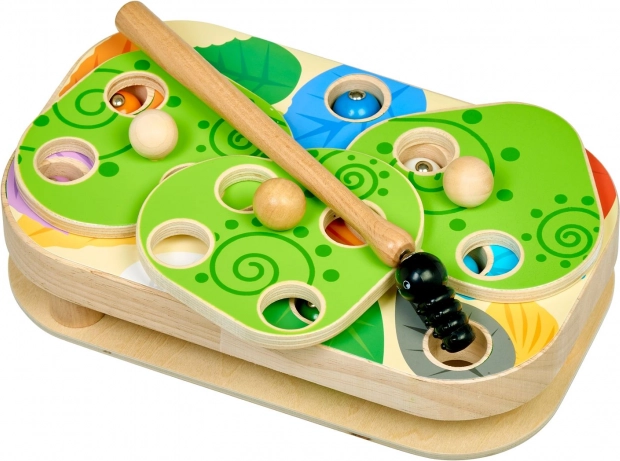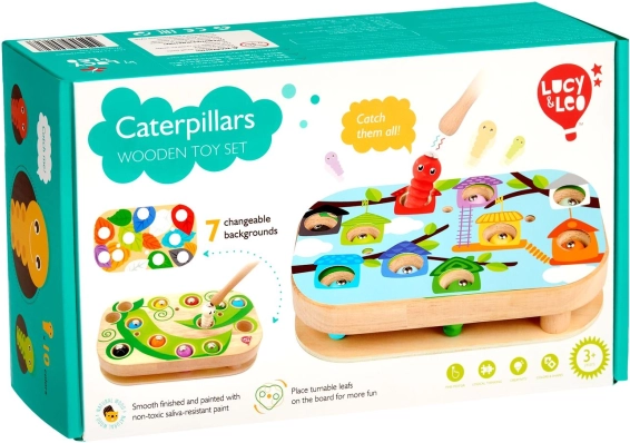 Het leuke en educatieve spel Lucy & Leo het vangen van rupsen ontwikkelt de fijne motoriek, het logisch denken en de oog-handcoördinatie. Met een magnetisch stokje vangen kinderen gekleurde rupsen in de openingen van het houten bord en proberen ze verschillende moeilijkheidsniveaus met verwisselbare sjablonen en draaibare bladeren.
