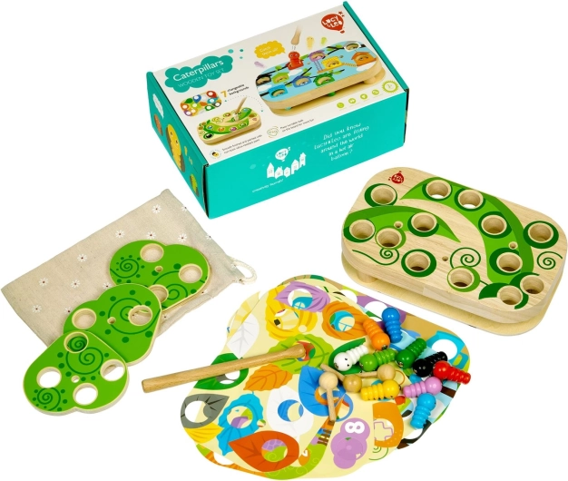 Het veilige magnetische stokje helpt kinderen de gekleurde rupsen in de openingen te vangen. Ontwikkelt fijne motoriek, coördinatie en geduld.