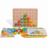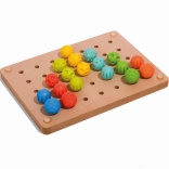 De houten basis met gaten maakt het eenvoudig om de pinnetjes te plaatsen, terwijl gekleurde veters een extra speeldimensie toevoegen: de mogelijkheid om te borduren. De eigenschappen van dit speelgoed maken het tot een fantastisch educatief hulpmiddel dat ook in Montessori-omgevingen wordt gebruikt.