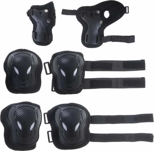 Zorg voor uw veiligheid tijdens sportactiviteiten met deze set beschermers voor knieën, ellebogen en polsen. Het ontwerp zorgt voor veiligheid en comfort, ideaal voor skateboarden of fietsen.