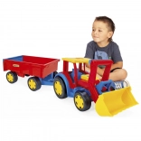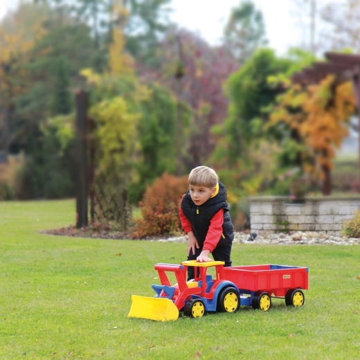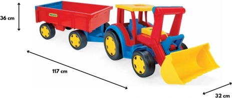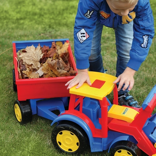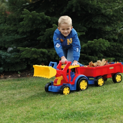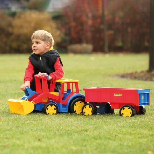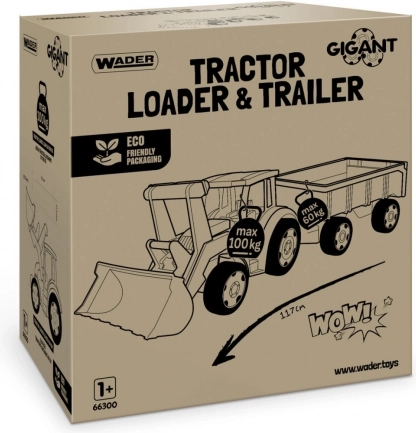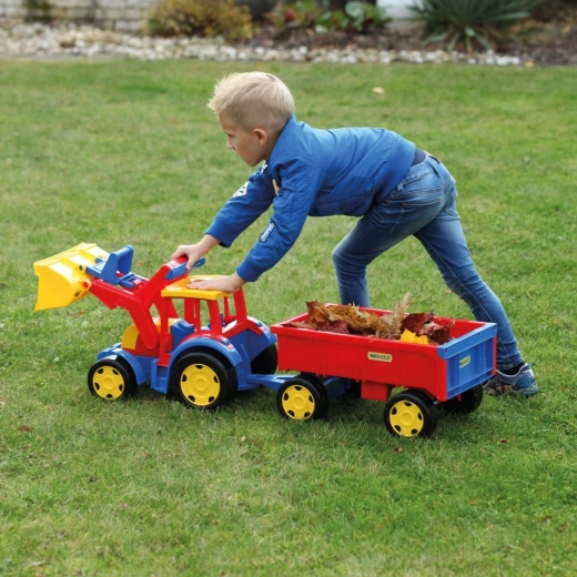 De gigantische kindertractor met aanhanger van Wader zal kleine bouwers verrassen: hij is 117 cm lang, heeft een bewegende voorlader, een openende achterklep van de aanhanger en een uitzonderlijk draagvermogen tot 100/60 kg. Gemaakt van veilig, duurzaam plastic geschikt voor spelen binnen en buiten en stimuleert motoriek en verbeelding.