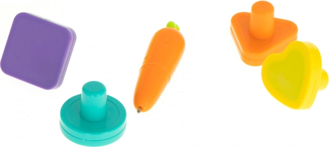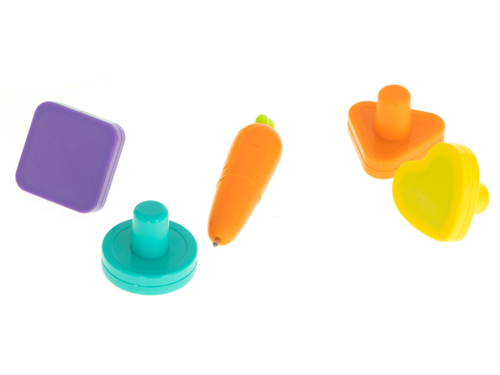 De interactieve elementen brengen dierengeluiden, geluiden van voertuigen, geluiden uit het huishouden en vrolijke melodieën. Het speelgoed heeft 2 geluidsniveaus en de mogelijkheid om het geluid volledig uit te schakelen. De pen in wortelvorm geeft bij het insteken in het “bekje” van het paardje een knapperend effect. De randen van het bord zijn versierd met verhoogde letters en cijfers – ideaal voor een eerste kennismaking met vormen.