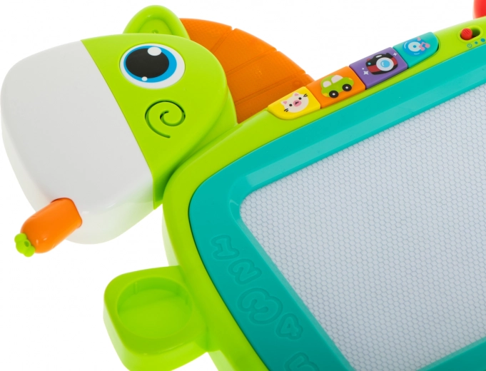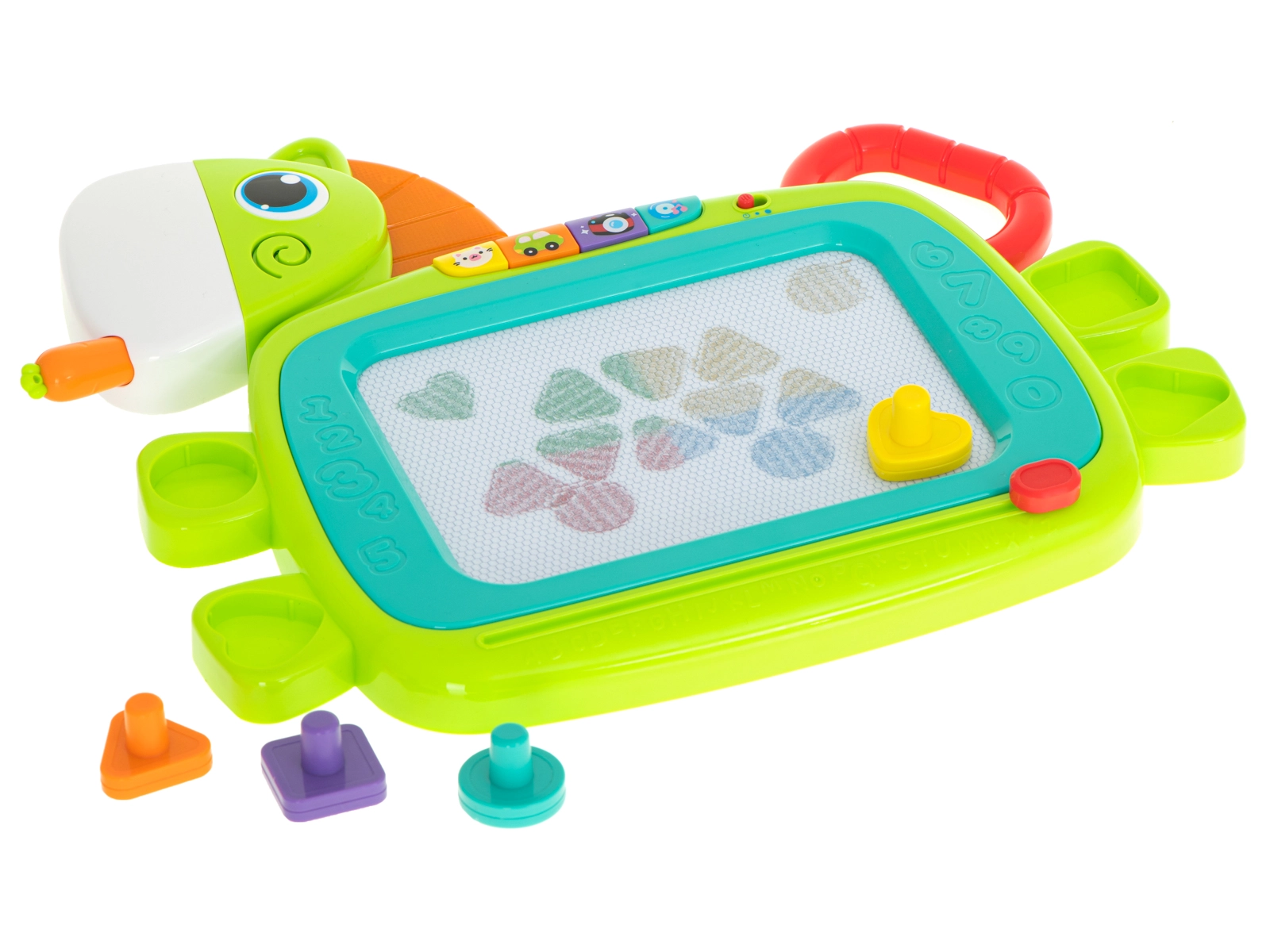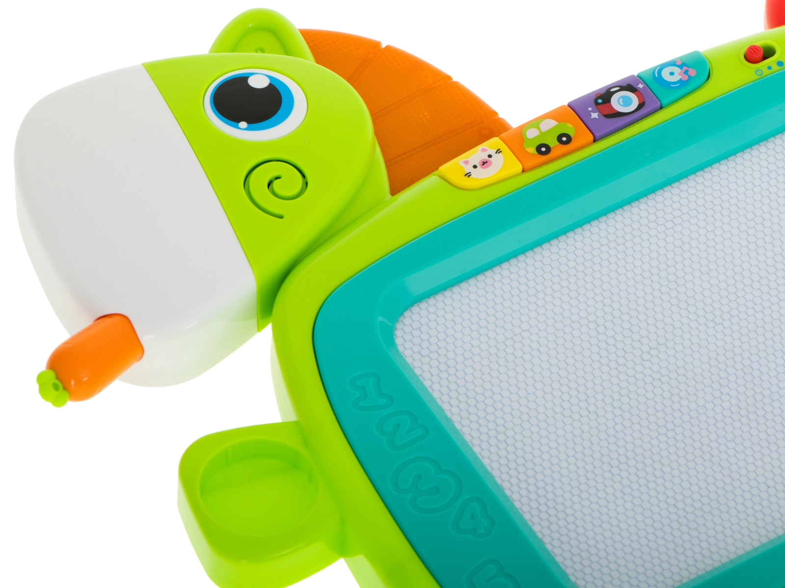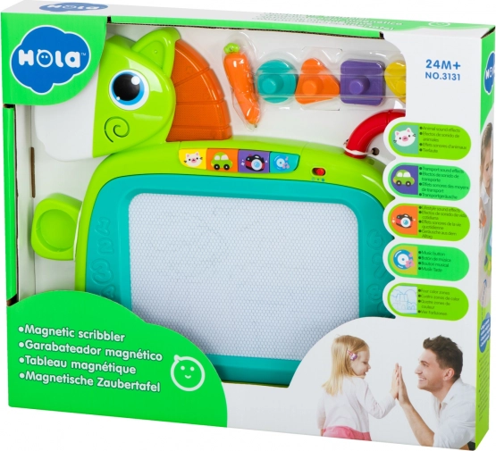 Het magnetische bord van HOLA is een geweldige keuze voor de ontwikkeling van creativiteit en fijne motoriek. Dankzij vier gekleurde zones ontstaan er tekeningen in aantrekkelijke kleuren die kinderen leuk vinden. Met één beweging van de schuifregelaar wis je het oppervlak en is het klaar voor nieuwe ideeën. De paardenvorm met een oplichtende manen en vrolijke geluiden motiveert kinderen om te spelen.