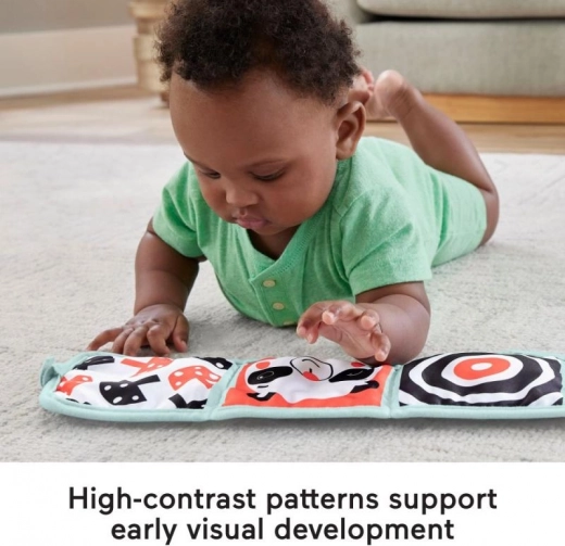 Ontdek de wereld samen met je baby dankzij het zachte opvouwbare paneel FISHER‑PRICE Fold & Play. Elk van de vier dubbelzijdige zijden biedt een aantrekkelijke activiteit: spiegeltje voor zelfherkenning, knisperende texturen, bewegende flapjes, rammelende kraaltjes en andere tactiele prikkels. Het hoge contrast ondersteunt de visuele ontwikkeling van pasgeborenen, terwijl kleuren en diertjes de natuurlijke nieuwsgierigheid prikkelen.