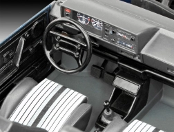 De set bevat een model van de Duitse compacte auto VW Golf van de eerste generatie, 6 basislakken, een penseel en lijm.
