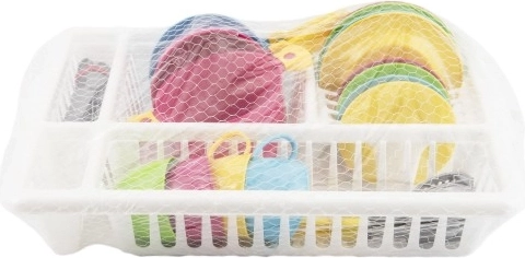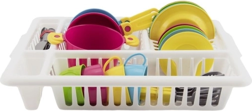 De speelkeuken komt tot leven met deze kleurrijke serviesset voor kinderen met een praktisch afdruiprek. Bevat bordjes, kommetjes, bekers en bestek in vrolijke kleuren die creatief spel, ontwikkelen van de fijne motoriek en leren van huishoudelijke taken op een speelse manier stimuleren.