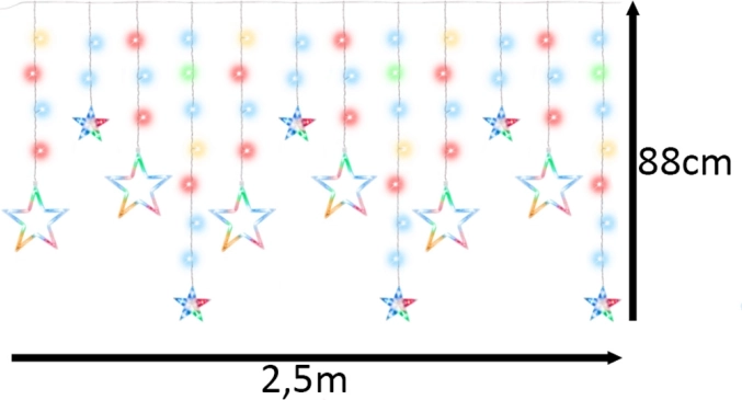 Dit decoratieve LED-gordijn met grote en kleine sterren laat elk raam of elke muur stralen en creëert een aangename sfeer voor feestdagen en gewone avonden. Dankzij 138 energiezuinige LED’s verlicht het subtiel zelfs een grotere kamer en vormt het een perfect decor voor familiefoto’s.