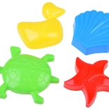 Vier kunststof vormen in de vorm van een eendje, schelp, schildpad en ster voor het eenvoudig en leuk vormen van dynamisch zand.