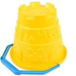 De kunststof emmer met blauwe handgreep en vormpjes binnenin maakt het eenvoudig mee te nemen naar het strand of de tuin.