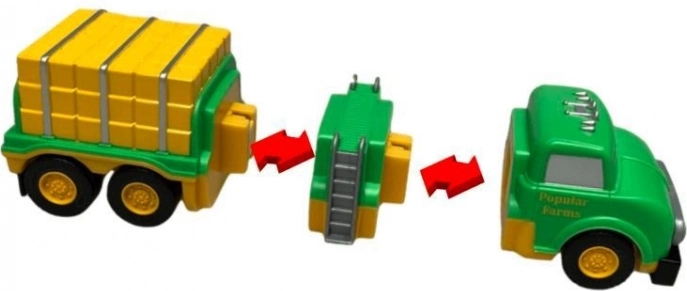 De set bevat modellen van een tractor, maaidorser en vrachtwagen met afneembare onderdelen. De robuuste kunststof weerstaat dagelijks spel, terwijl realistische details en opschriften zoals “Popular Farms” thematisch boerderijverhaalspel stimuleren.