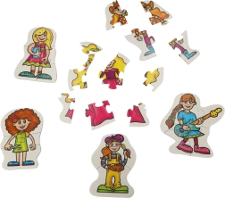 De set bevat in totaal 27 stukjes, verdeeld over 6 afbeeldingen met een meisjesachtig thema. Dankzij de dikte van 3 mm liggen de stukjes goed in kleine handjes en passen ze stevig in elkaar. Geweldig als cadeau en als activiteit om samen met ouders te doen.